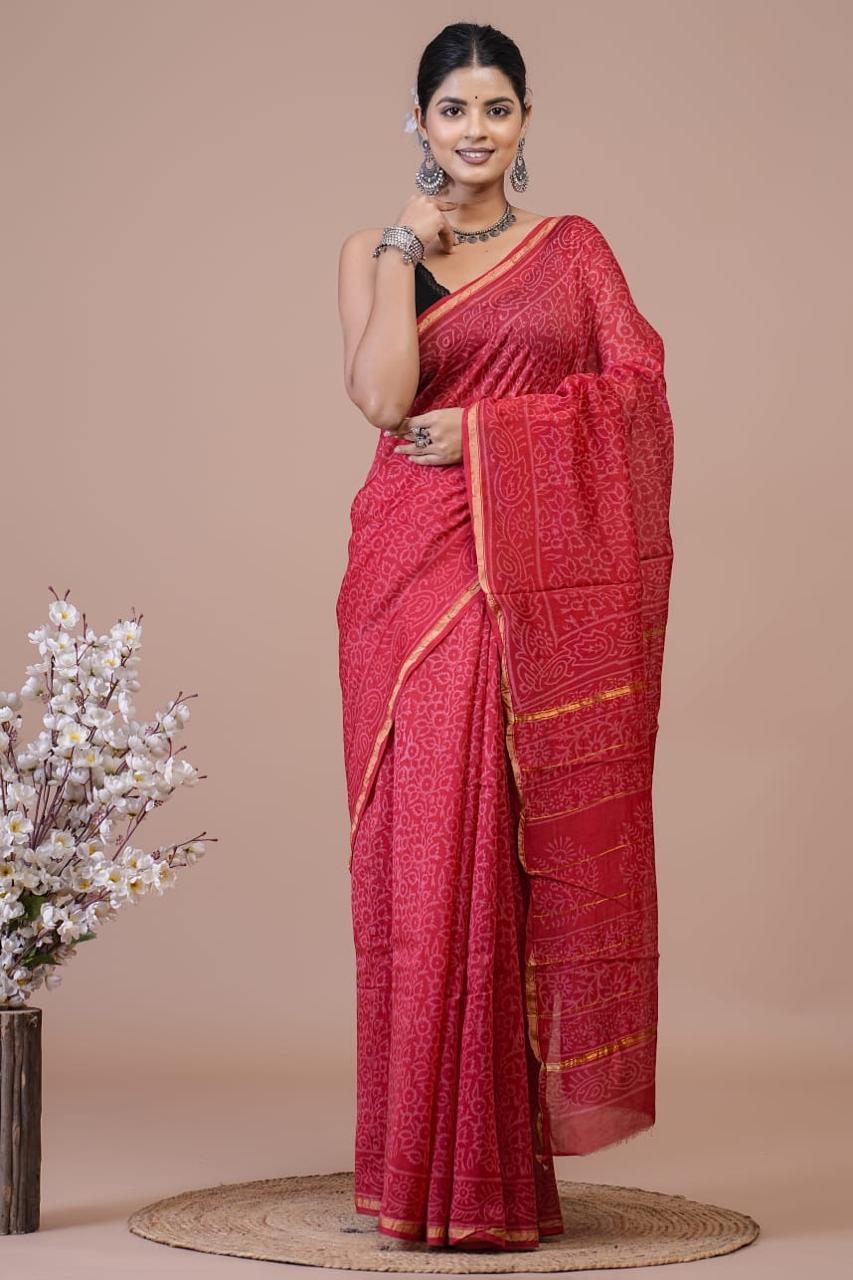 Chanderi sarees represent the historic town of Chanderi in Madhya Pradesh. Chanderi is a traditional ethnic fabric. Chanderi fabric is produced by weaving in silk and golden Zari characterized by its lightweight, sheer texture and fine luxurious feel.